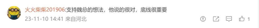 对于魏建军的观点,有网友表示,“支持魏总的想法,他说的很对,底线很重要”。也有网友问:“说的是哪家?”