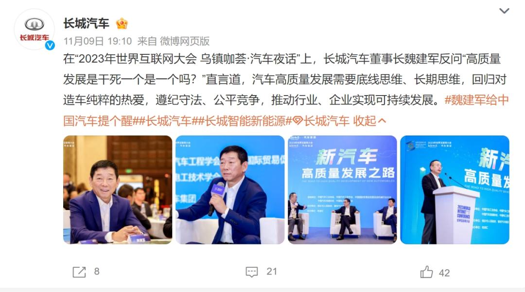 据长城汽车官网微博,在日前寰球汽车举办的“2023年世界互联网大会乌镇咖荟·汽车夜话”上,魏建军谈到关于“高质量发展”的话题时反问道:“高质量发展是干死一个是一个吗?”