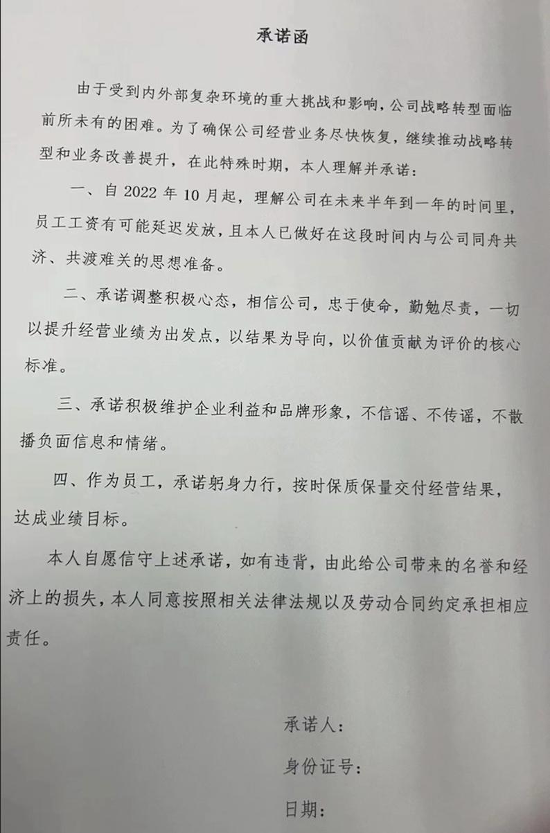 更离谱的是,国美还被曝出过一份 要求员工签署同意延发工资的承诺书。