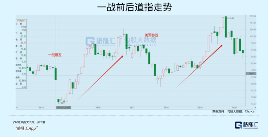 一战爆发的第一个月,道琼斯指数一度跳空下跌,但仅仅两个月后,就开始暴利反弹。