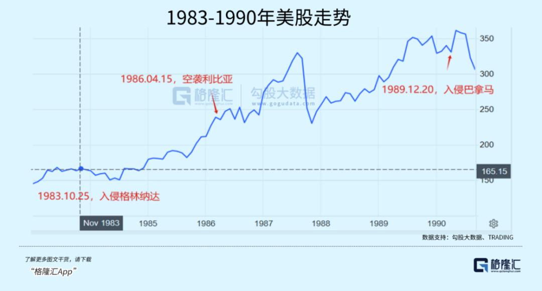 1983-1990年,美军先后入侵格林纳达、空袭利比亚、入侵巴拿马,道琼斯指数的涨幅,分别是123%、48%、22%。