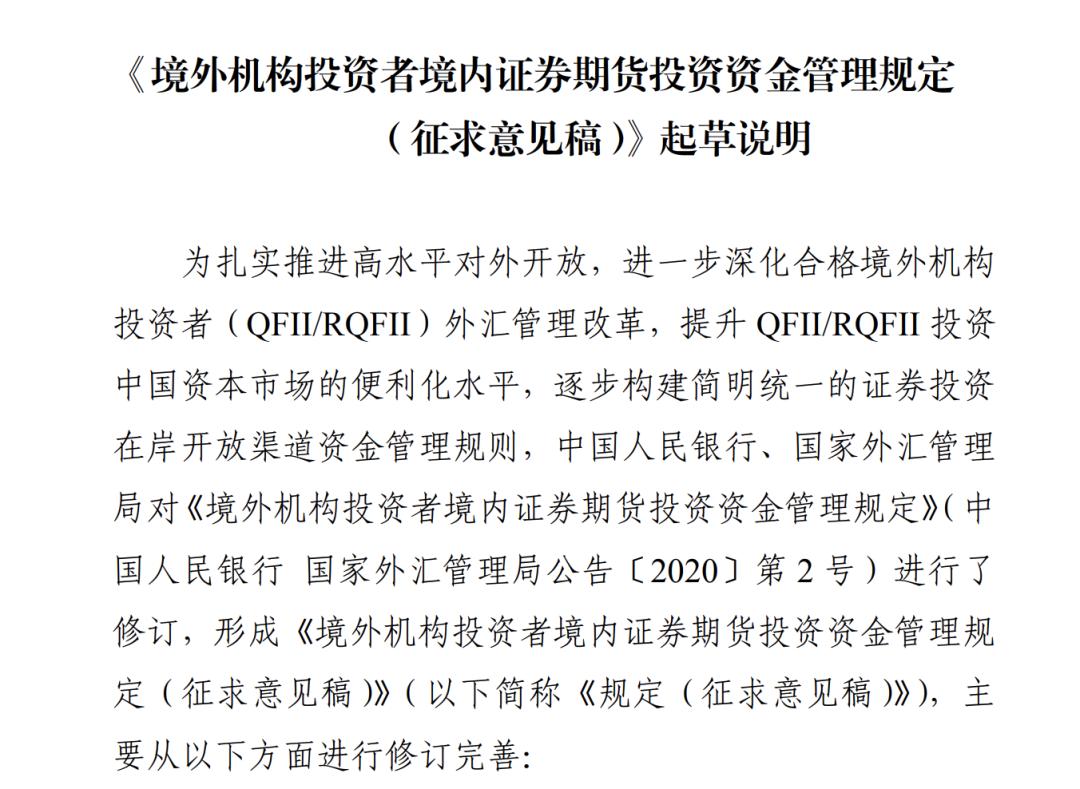 据国家外汇管理局官网11月10日发布的消息,中国人民银行、国家外汇管理局对2020年发布的《境外机构投资者境内证券期货投资资金管理规定》进行了修订,形成了《境外机构投资者境内证券期货投资资金管理规定(征求意见稿)》(简称“征求意见稿”),现向社会公开征求意见,意见提交截止日为12月10日。