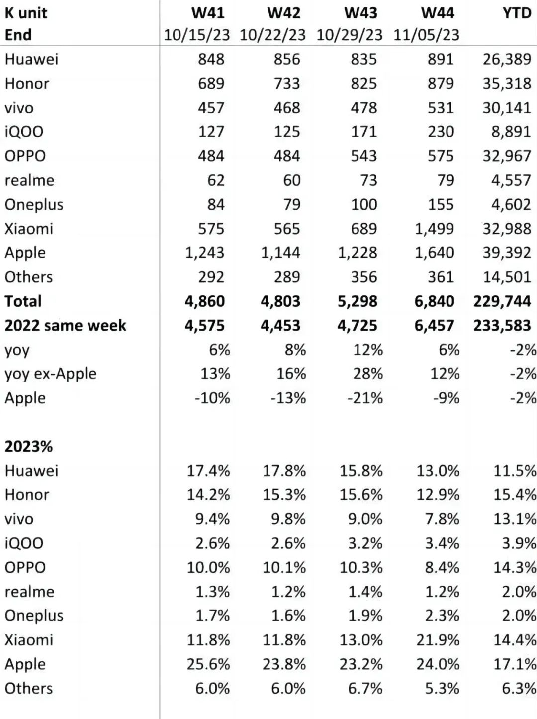 根据表格显示,2023 年 W44 (10.30-11.5),苹果销量 164 万台,小米销量 150 万台,国产第一。