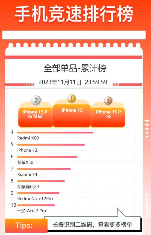 从京东的榜单可以看到,今年双 11 ,最多人买的三台手机分别是:iPhone 15、iPhone 15 Pro Max、iPhone 15 Pro 。
