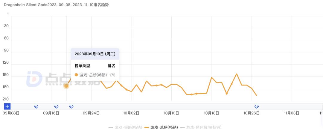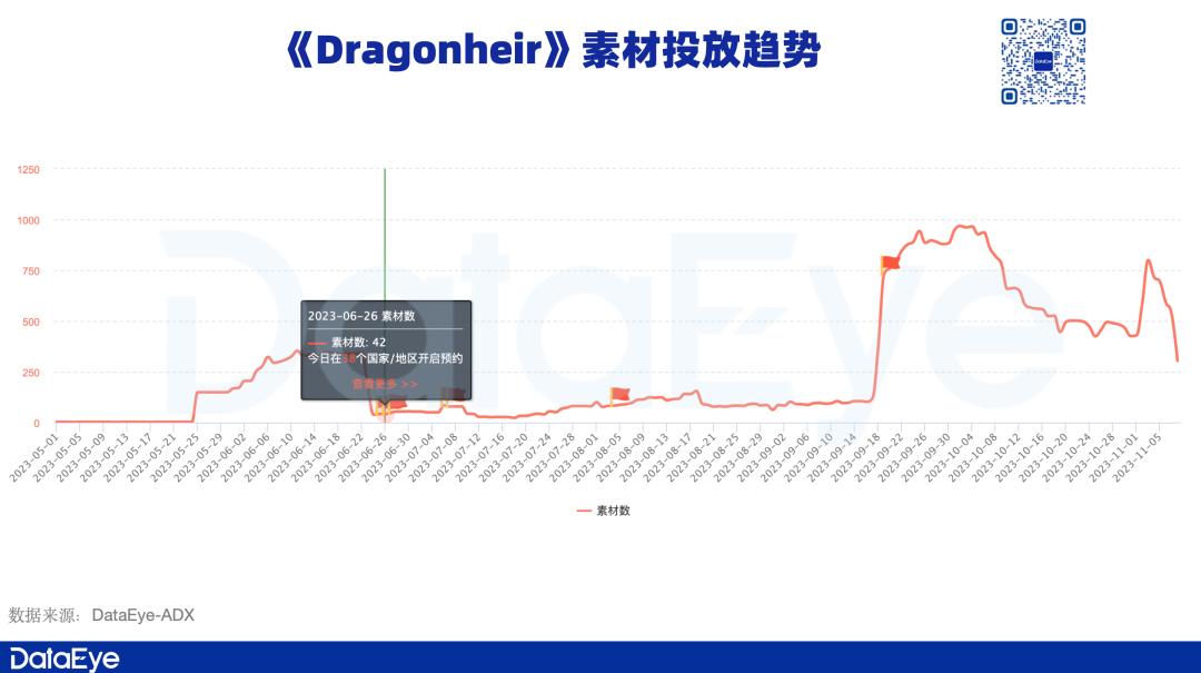 这或许与其在营销侧的打法有密切关系,DataEye研究院观察到,《Dragonheir: Silent Gods》既不做“上线送连抽”、“送高阶英雄”的营销方案,也不制作大量真人素材做推广。而是重品牌、重质感,这个打法有优势,也有局限性。