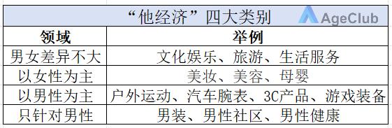 《商业周刊》基于与“她经济”的比较,将“他经济”消费领域划分为四大类别,展示出中老年男性在消费领域的鲜明偏好。
