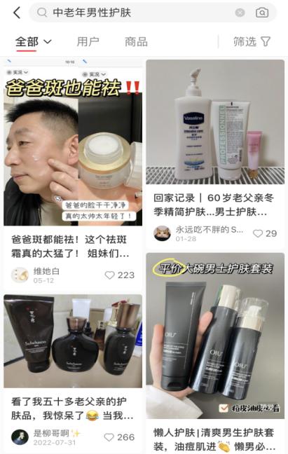 据巨量指数,2022年以“男士护肤”为关键词的搜索指数同比上涨285%,小红书平台围绕中老年男性个人护理话题的笔记众多,且热度仍持续攀升。