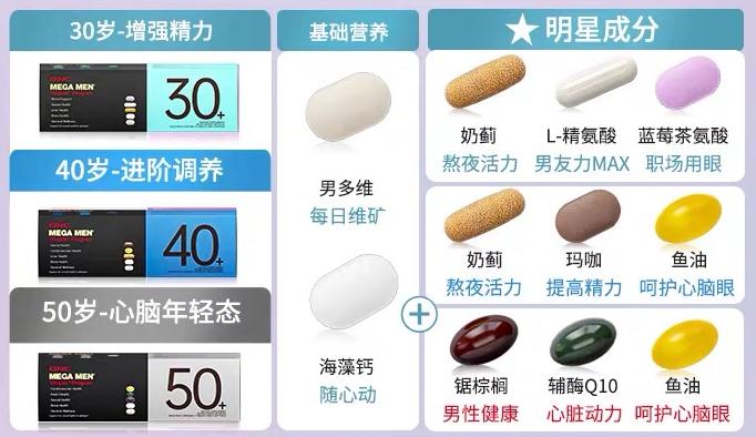 例如,健安喜为40+和50+男性推出每日营养包,针对不同年龄段人群的需求定制升级版精准营养成分。其中,40+营养包针对工作压力大、饮食不规律人群,50+营养包主打预防心血管问题和预防前列腺炎与男性脱发。
