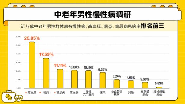 根据美团《中老年男性群体健康状况调研》结果,在中老年男性身体健康调查中,高血压、咽炎、糖尿病的患病率排名前三,其中高血压在中老年男性人群体中最为普遍。