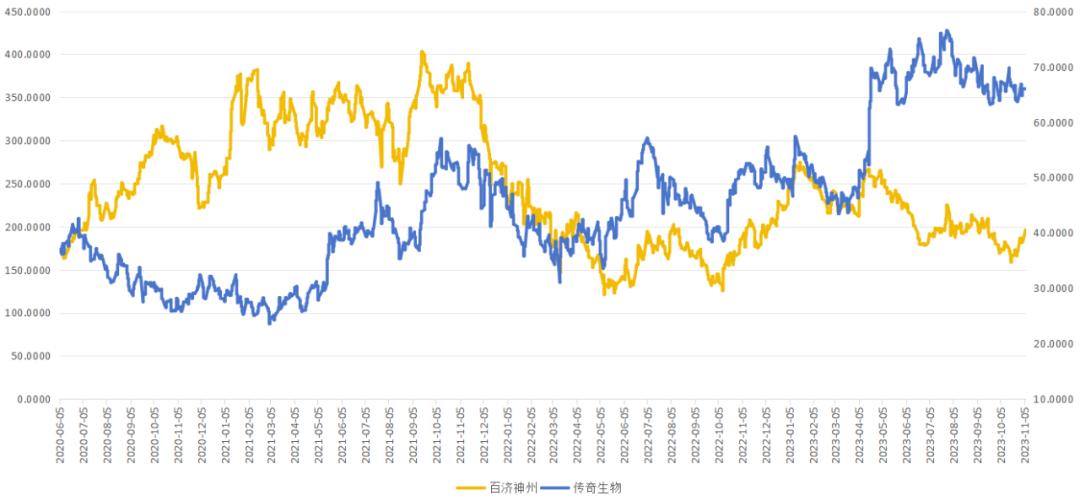 图:百济神州与传奇生物美股股价,来源:锦缎研究院
