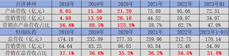 聚焦百济神州商业化初期的表现,其2018年依靠代理产品能够实现8.64亿元的营收,而营销费用为4.88亿元,营销费用占产品营收比重约为56.4%。这样的营销效率如何呢?通过与中国制药一哥恒瑞医药的对比就能知晓一二。