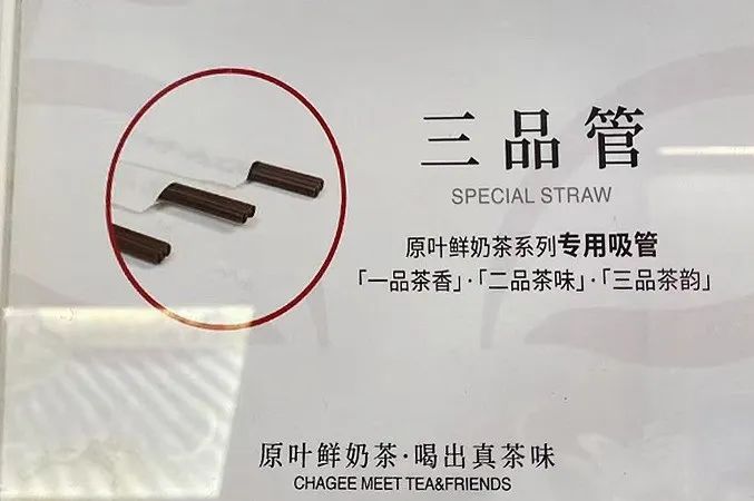 霸王茶姬对三品管的用法则有不同解释,在门店的海报上写道:三品管,原叶鲜奶茶系列专用吸管,一品茶香,二品茶味,三品茶韵。