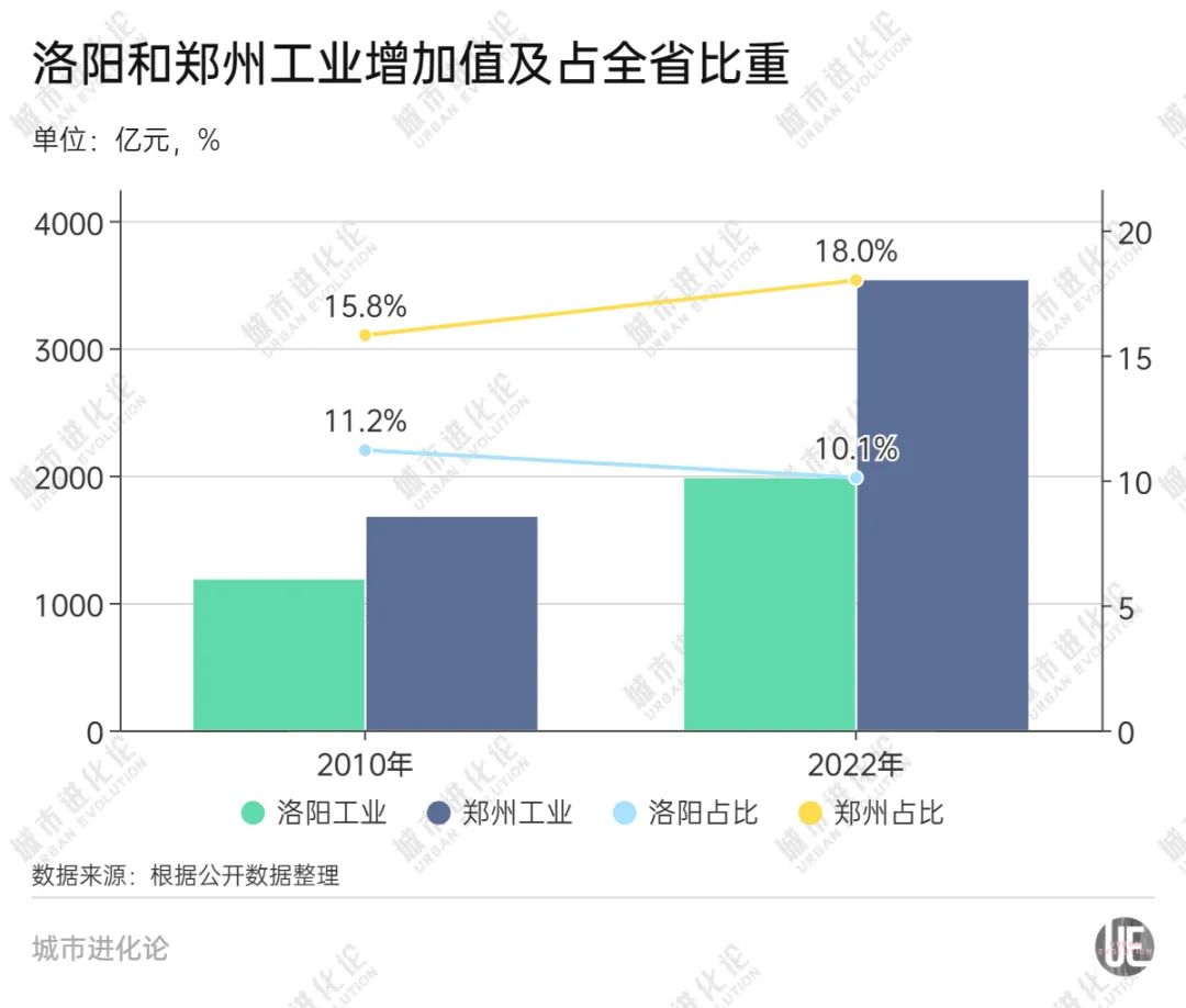 进一步看工业占比,也呈现出同样的趋势。对比2010年和2022年数据,洛阳工业增加值占全省比重从11.2%下滑至10.1%,同期郑州占比从15.8%上升至18.0%。数据上的不同走势,直观反映出在郑州工业快速发展的同时,洛阳逐渐开始“掉队”了。