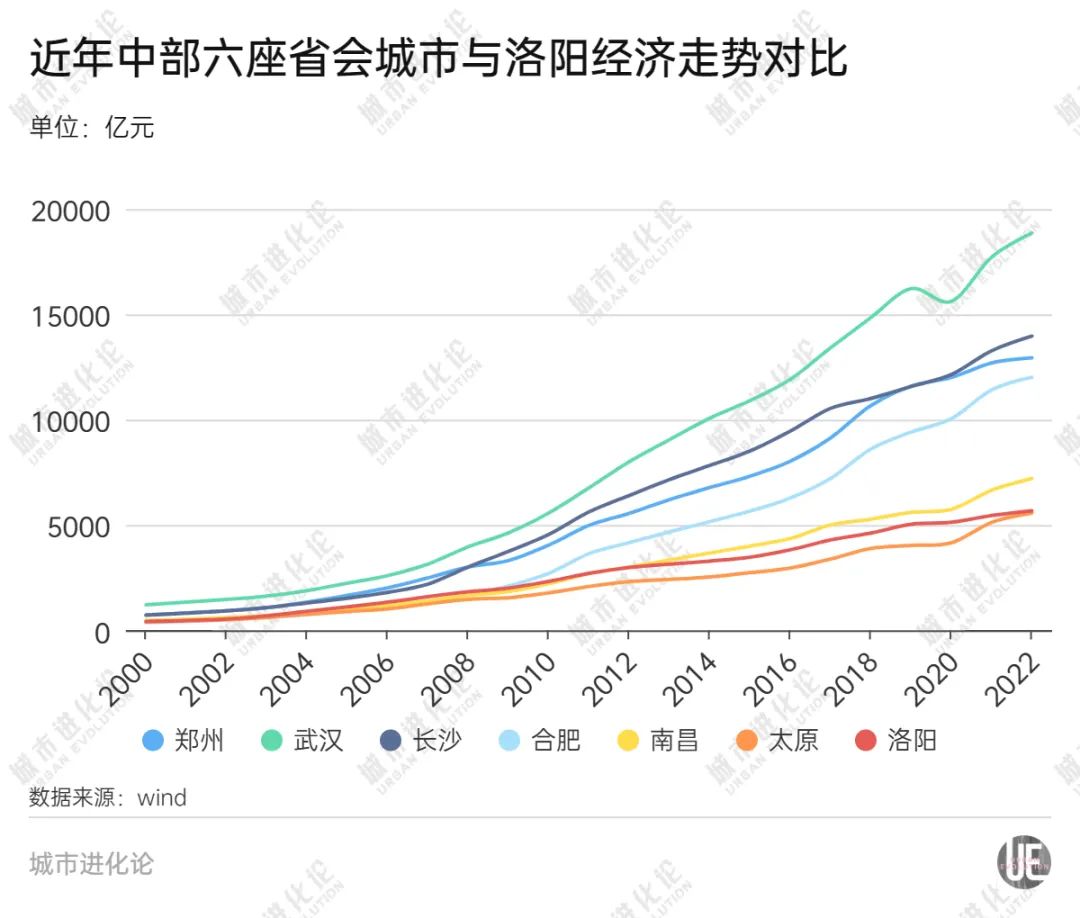 实际上,十余年前,洛阳都还有跟中部六座省会城市一较高下的实力。比如常常被洛阳提及的合肥,从2000年至2009年,洛阳和合肥“你追我赶”,洛阳九度领先。2009年,洛阳被合肥反超,差距不断拉大,至今经济总量已不及后者的一半。
