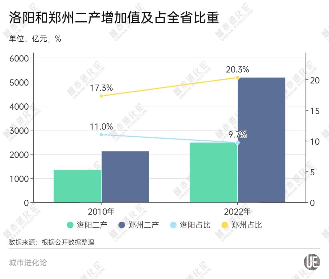 2010年,洛阳、郑州二产增加值分别为1338.3亿元、2109.3亿元,占全省比重分别为11%、17.3%,差距尚且不大。到了2022年,两市二产增加值分别达到2473.9亿元、5174.6亿元,占全省比重分别为9.7%、20.3%。十多年间,洛阳占比下降1.3%,郑州占比上升3.0%。