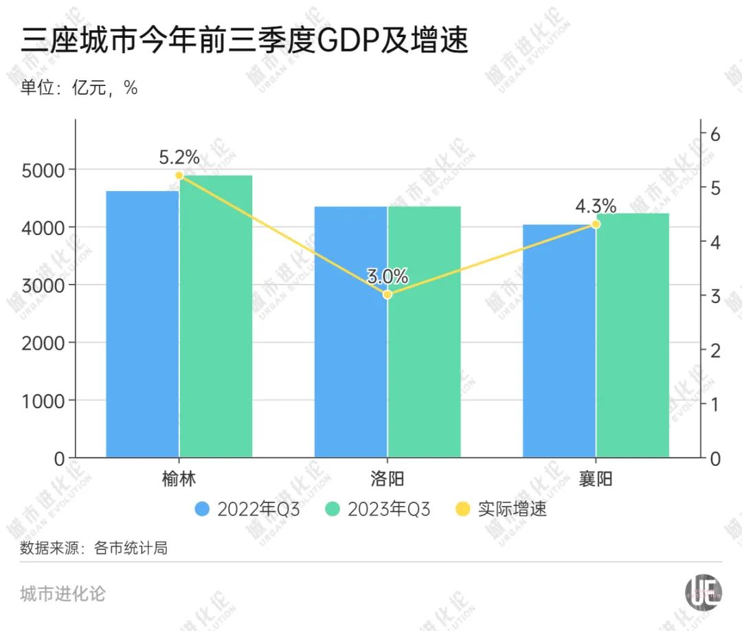 更重要的是,对比去年同期经济数据,洛阳前三季度GDP增量仅3.3亿元,名义增长不足0.1%,对一座经济体量达到5000多亿元的城市而言,这个数字,几乎可以忽略不计。
