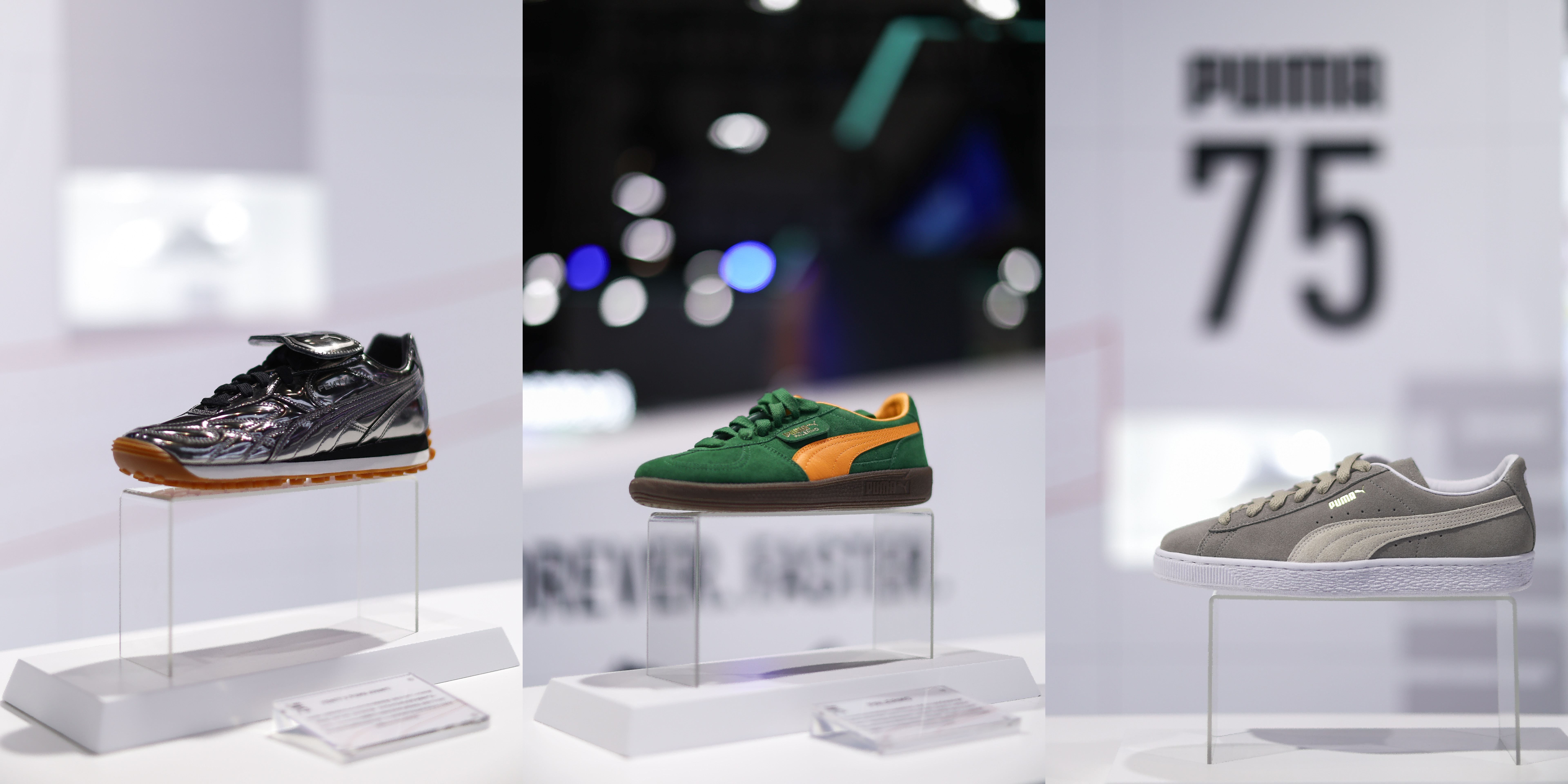 从左至右依次为,FENTY x PUMA鞋款、PALERMO鞋款、PUMA x JJJJOUND SUEDE鞋款