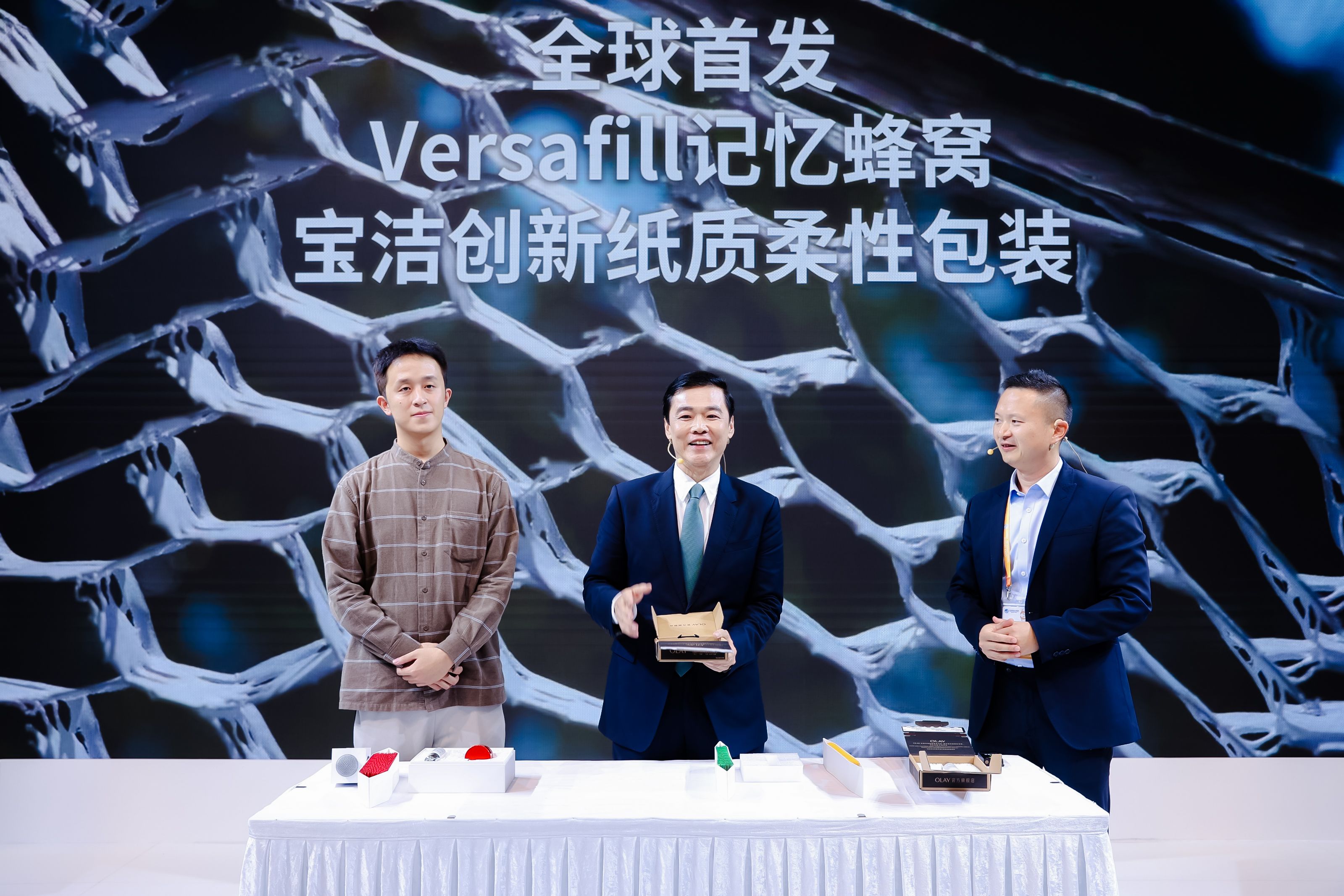 过去几年,宝洁也在不断创新供应链包装的形式和功能,推出多款电商新包装。活动现场,宝洁全球首发创新纸质柔性包装——Versafill记忆蜂窝。它的灵感和元素来自于大自然,通过材料、力学、结构和几何的巧妙设计,让纸张变成可依照产品形状进行变化并固定产品的柔性包装。该包装具有三大特点:柔性——可依照产品形状进行变化,压下即刻成型,灵活适应不同产品;优质——可很好地固定产品,减少产品磨损或变形,并带给消费者良好的开启体验;绿色——使用可回收的纸张材料制成,巧妙的拉伸结构可减少高达85%的材料储运体积。宝洁大中华区首席可持续发展官、传播与公关副总裁许有杰、宝洁大中华区供应链包装创新总监杨万敏以及记忆蜂窝的发明人宝洁大中华区创新包装经理李鹍一同在沟通会现场演示了记忆蜂窝的工作原理。