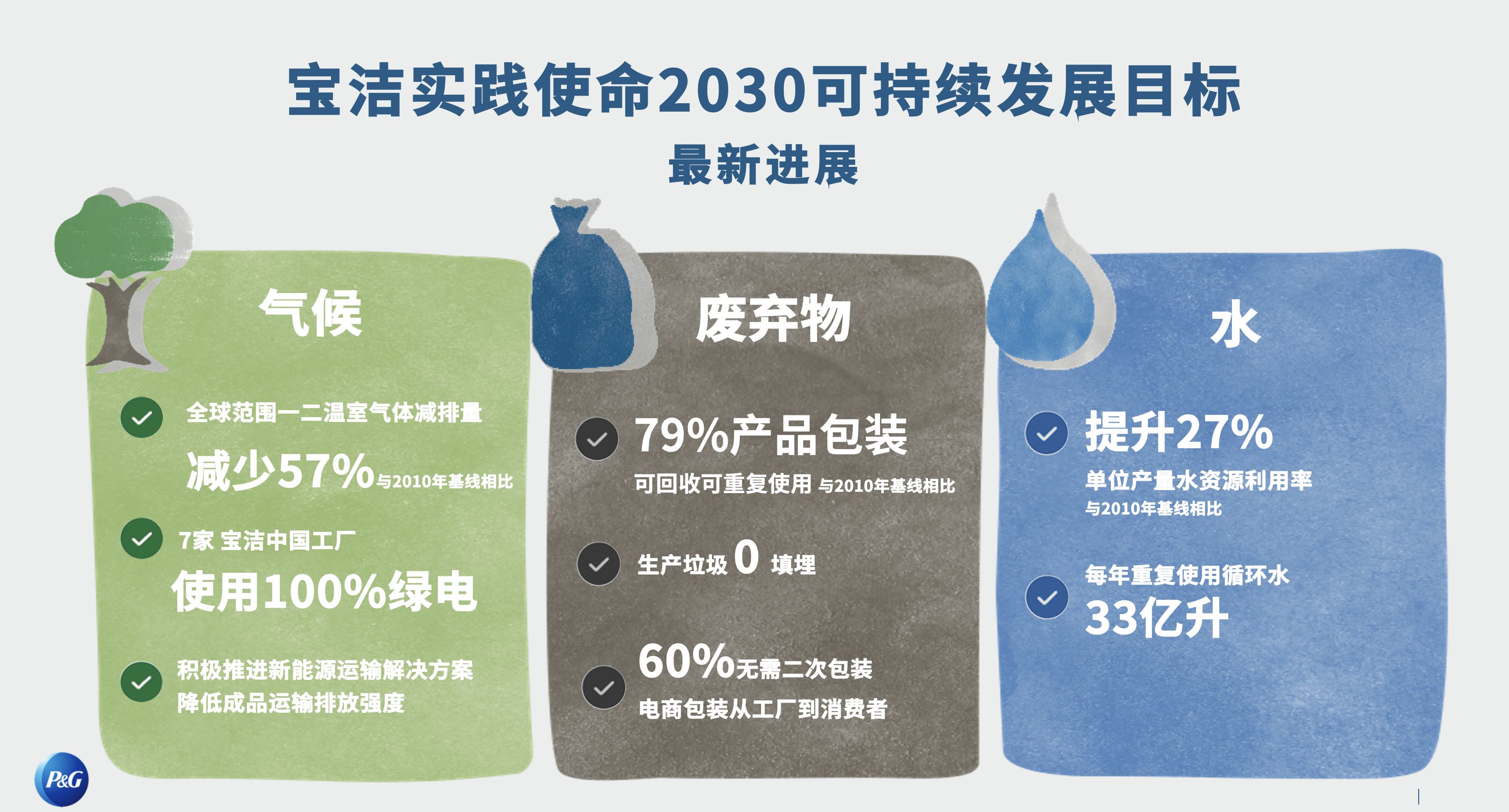 从负责任地生产、负责任地销售,到联合行业伙伴倡导负责任地消费,可持续发展已经融入到宝洁公司运营的方方面面。