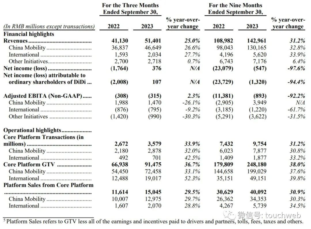 滴滴第三季度净利为3.76亿元,上年同期为净亏损17.64亿元。