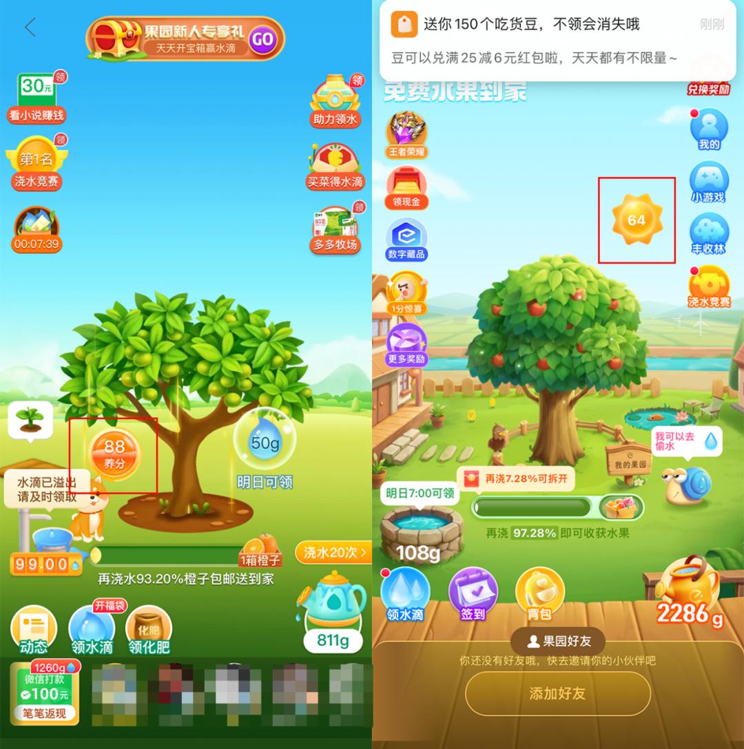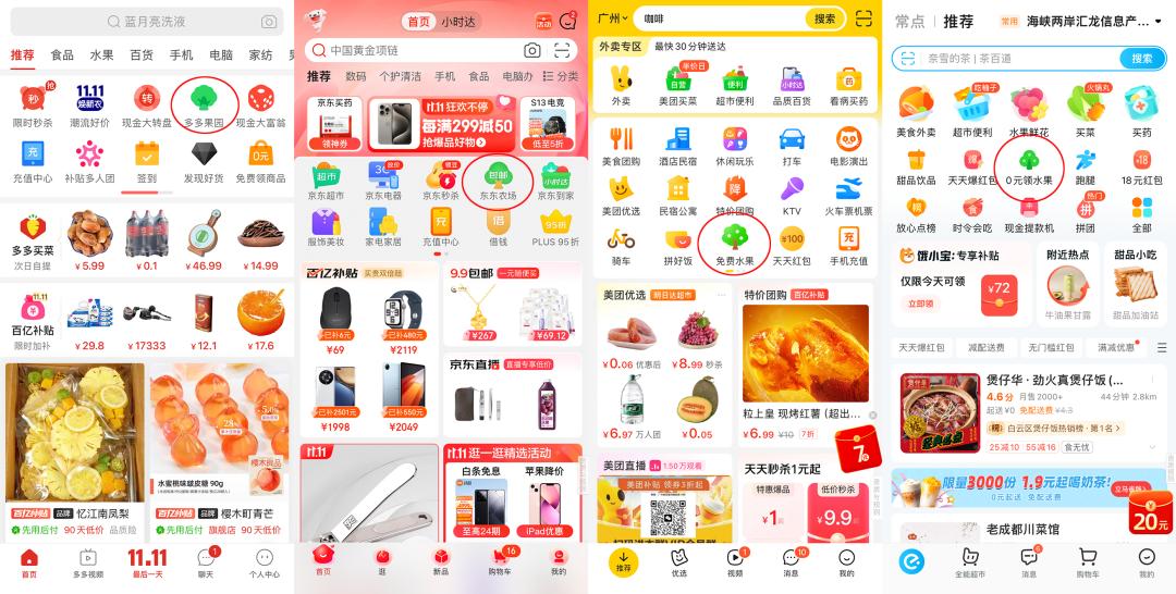拼多多首页有一个“多多果园”,京东首页有一个“京东农场”,美团和饿了么首页有一个“0 元领水果”,从它们入口位置来看,这些 App 对农场游戏比较重视。