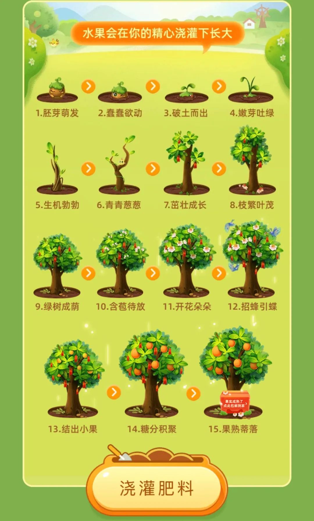 果树的成长速度芭芭农场也有讲究,把果树分成 15 个阶段,从发芽到开花,再到果实成熟,这么详细的阶段划分,高情商地说是细致入微,低情商地说则是套路满满。