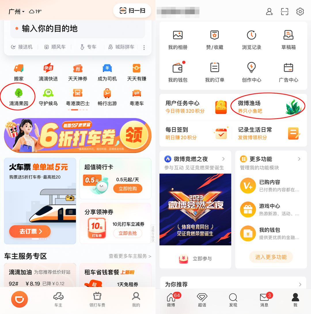 在滴滴 App 里,有滴滴果园,只不过,用户需要滑动内容区,才能找到;在微博里,有一个微博渔场。