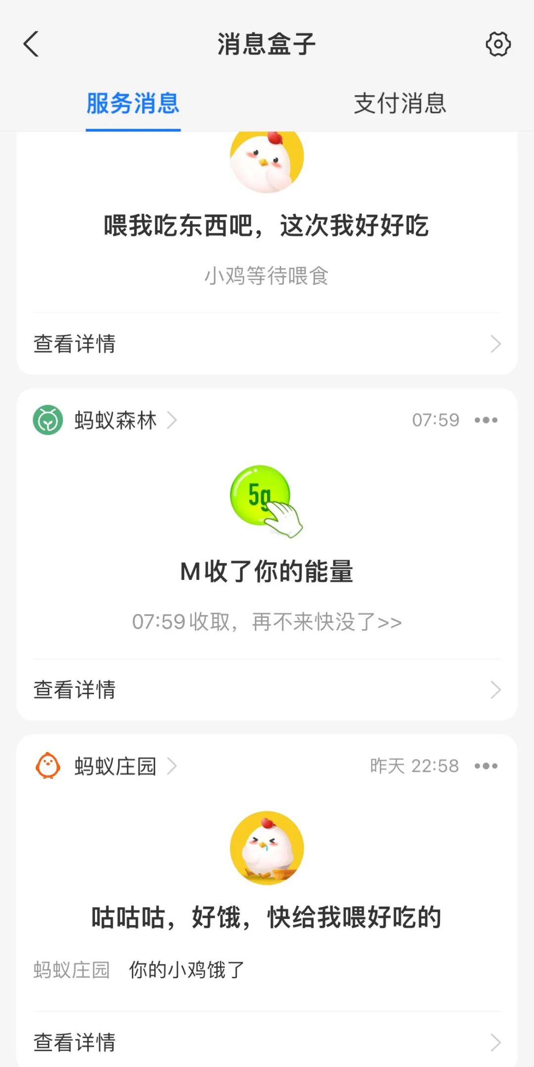支付宝上农场游戏就更多了,除了蚂蚁森林、还有蚂蚁庄园、芭芭农场,每天早上,果子打开支付宝,就能收到提醒,能量被人收走了、小鸡饿了……