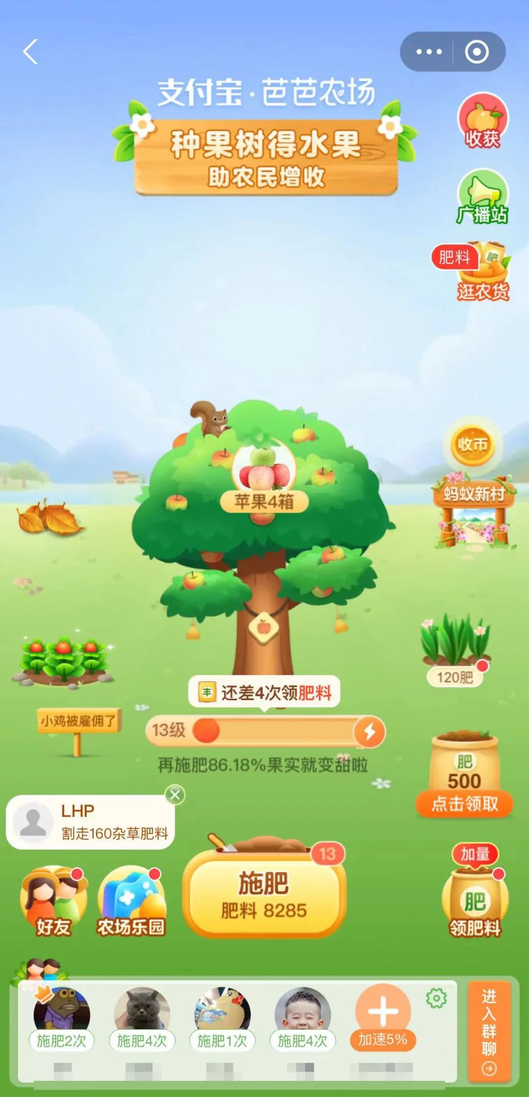 淘宝还给芭芭农场带来了社交玩法,可以叫上亲朋好友一起合种,一起领水果,队伍人数越多,果树各个等级需要的肥料越多。