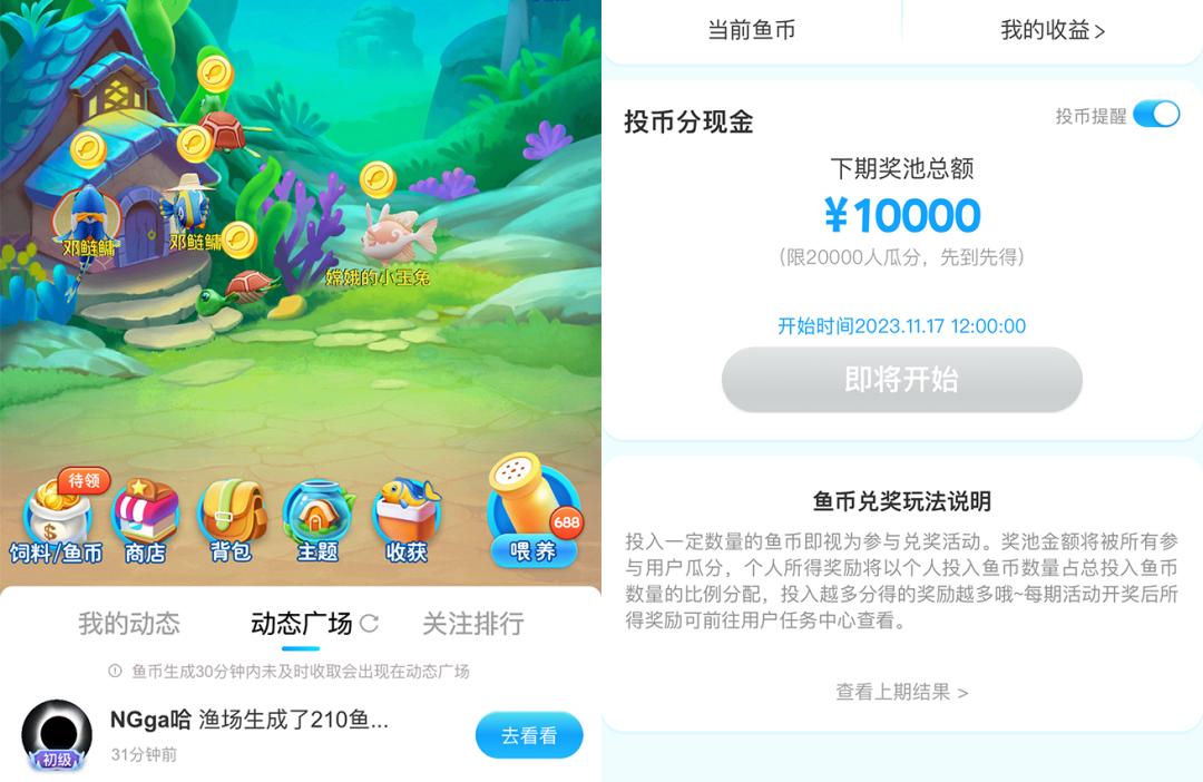 微博渔场比较特别,将鱼苗喂养长大,卖出可获得金币,不卖出鱼苗每隔6个小时也可以收取金币,每周五12点,可投入金币瓜分奖池现金。
