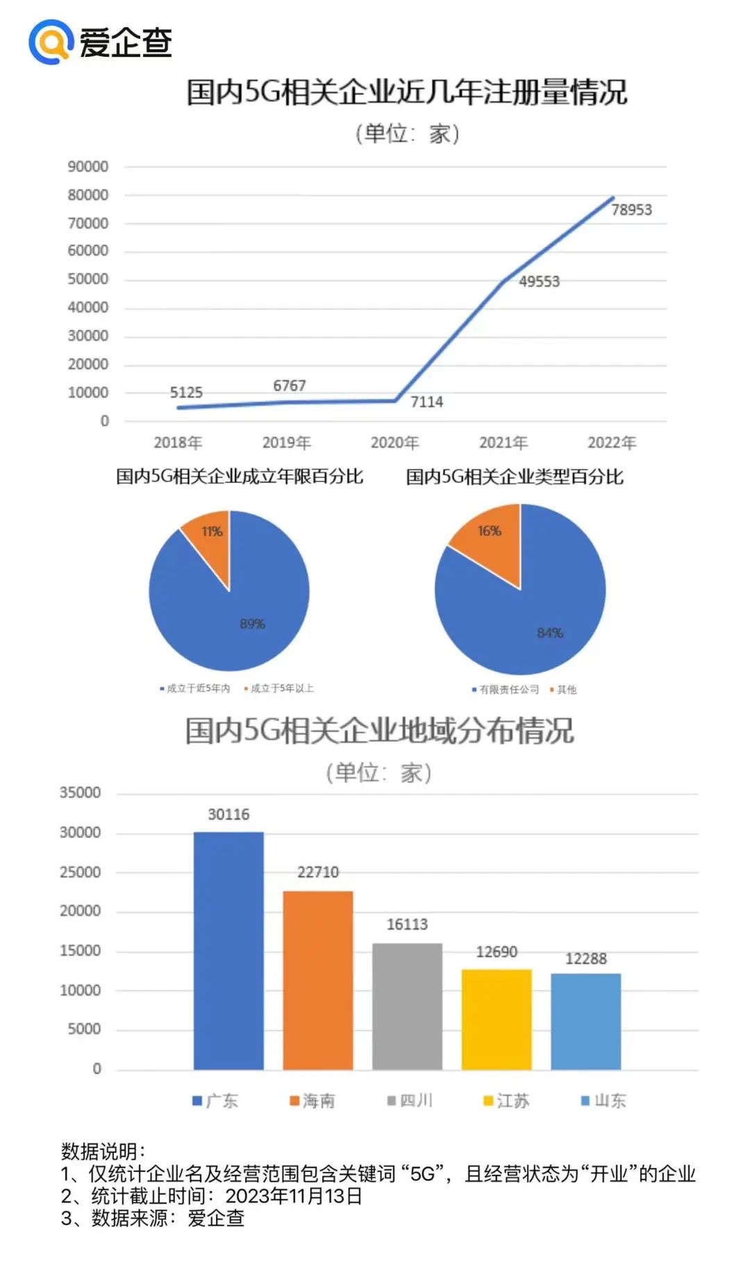 随着近年来信息技术突飞猛进的发展,5G技术成为备受瞩目的话题。爱企查数据显示,截至目前,国内现存近26万家5G相关企业。其中,2022年新增注册企业约7.9万家;2023年以来截至11月13日,新增注册企业约8.9万家,已经超过2022年全年的企业注册总量。从近5年企业注册整体趋势来看,2018年以来5G相关企业注册数量持续上涨,尤其是2020年以来增速明显。