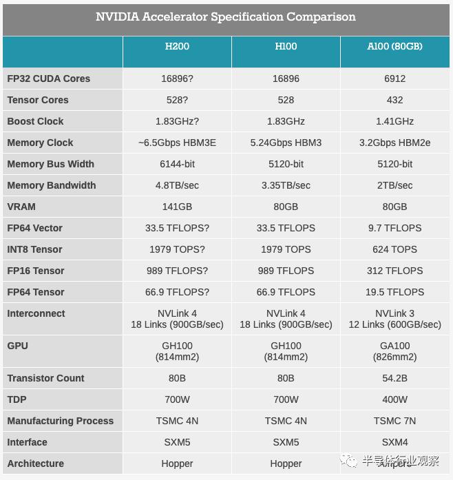不过据anadtech分析,H200 迄今为止仅适用于 SXM5 插槽,并且在矢量和矩阵数学方面具有与 Hopper H100 加速器完全相同的峰值性能统计数据。区别在于,H100 具有 80 GB 和 96 GB 的 HBM3 内存,在初始设备中分别提供 3.35 TB/秒和 3.9 TB/秒的带宽,而 H200 具有 141 GB 更快的 HBM3e 内存,带宽为 4.8总带宽 TB/秒。
