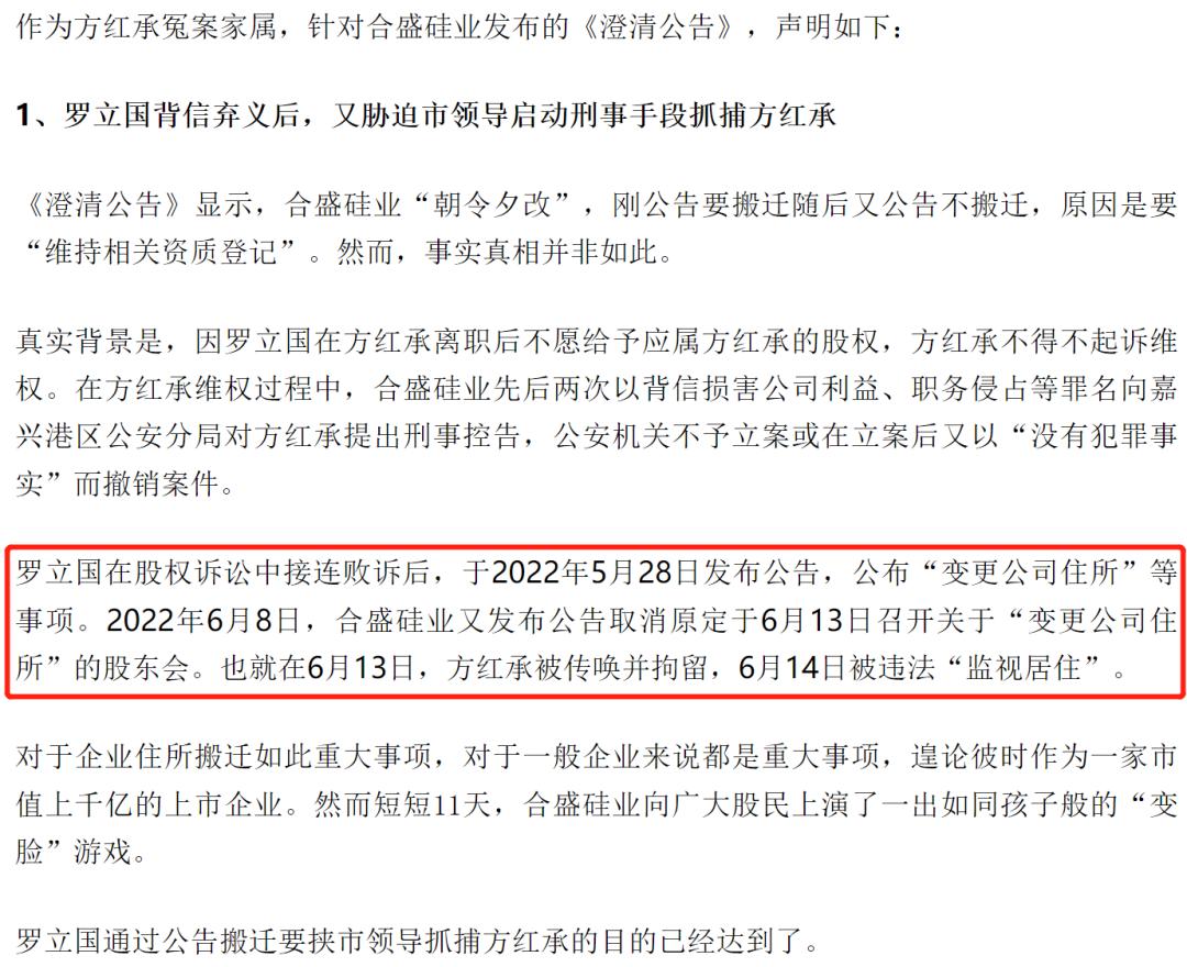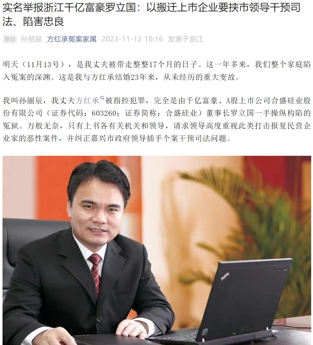 据媒体报道,11月12日,合盛硅业原总经理方红承妻子孙丽辰通过微信公众号在网上实名举报合盛硅业董事长罗立国,称罗立国股权官司败诉后,以变更公司住所、搬离嘉兴要挟有关部门,导致方红承、方红兴被关押至今。