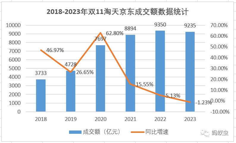 我统计了2018-2023年间淘天和京东双11成交额的数据 (2018-2020年为平台自己公布,2022、2023年则引自星图数据,包括拼多多和其他中小平台) ,可以清楚地看到,近年来双11的增速急剧下降。