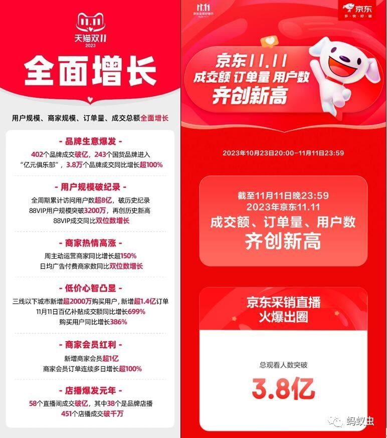 不过从具体诉求来说,两者的侧重点还是略有不同的,淘天重在用户规模的提升,而京东在意销量的增长。这从事后的双11战报也能看出来。淘天在将用户规模、商家规模放在了“全面增长”的前面,并且强调访问用户超过了8亿;而京东则在“齐创新高”中把成交额和订单量放在了用户数的前面。