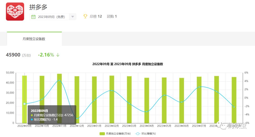 说到流量饥渴症,它并不是淘天和京东所独有的。像国美和苏宁易购的快速边缘化,某种意义上就是自主流量生产能力不断急剧下降的结果,以至于今年双11几乎彻底消失。艾瑞数据显示,即便是业绩不断攀升的拼多多,其月度独立设备数近一年来也呈现了下降趋势,2023年9月为4.59亿台,同比下断2.87%。