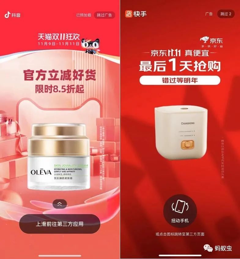直到双11当天倒计时的最后时刻,各个APP仍在拼命地投放两家的跳转广告。它俩今年双11的成绩好不好另说,但它们的努力是有目共睹的,不到最后一刻决不放松的精神值得钦佩。