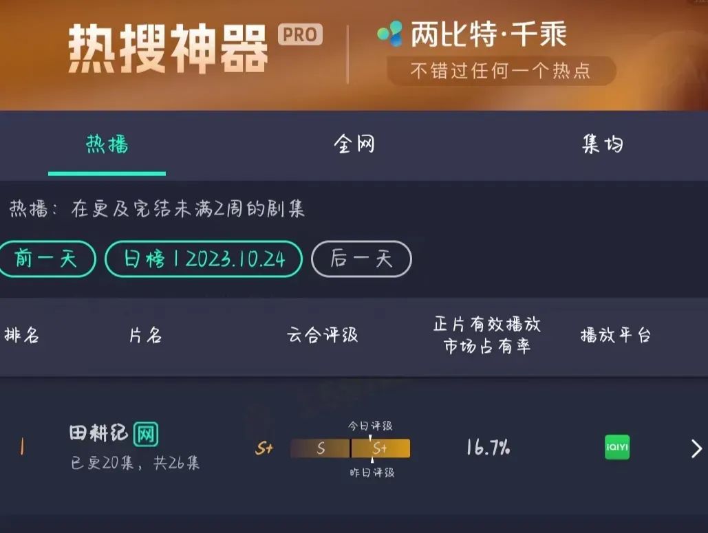 继年初刘亦菲主演的现象级田园治愈剧《去有风的地方》引发全网社畜的向往之后,爱奇艺新剧《田耕纪》继续唱响田园牧歌,以“全息游戏+种田”的新颖设定吸睛,云合市占率高达16.7%,剧集全端播放量已破5亿,领跑十月网剧市场,网友直呼“种田文照进现实,过瘾”。