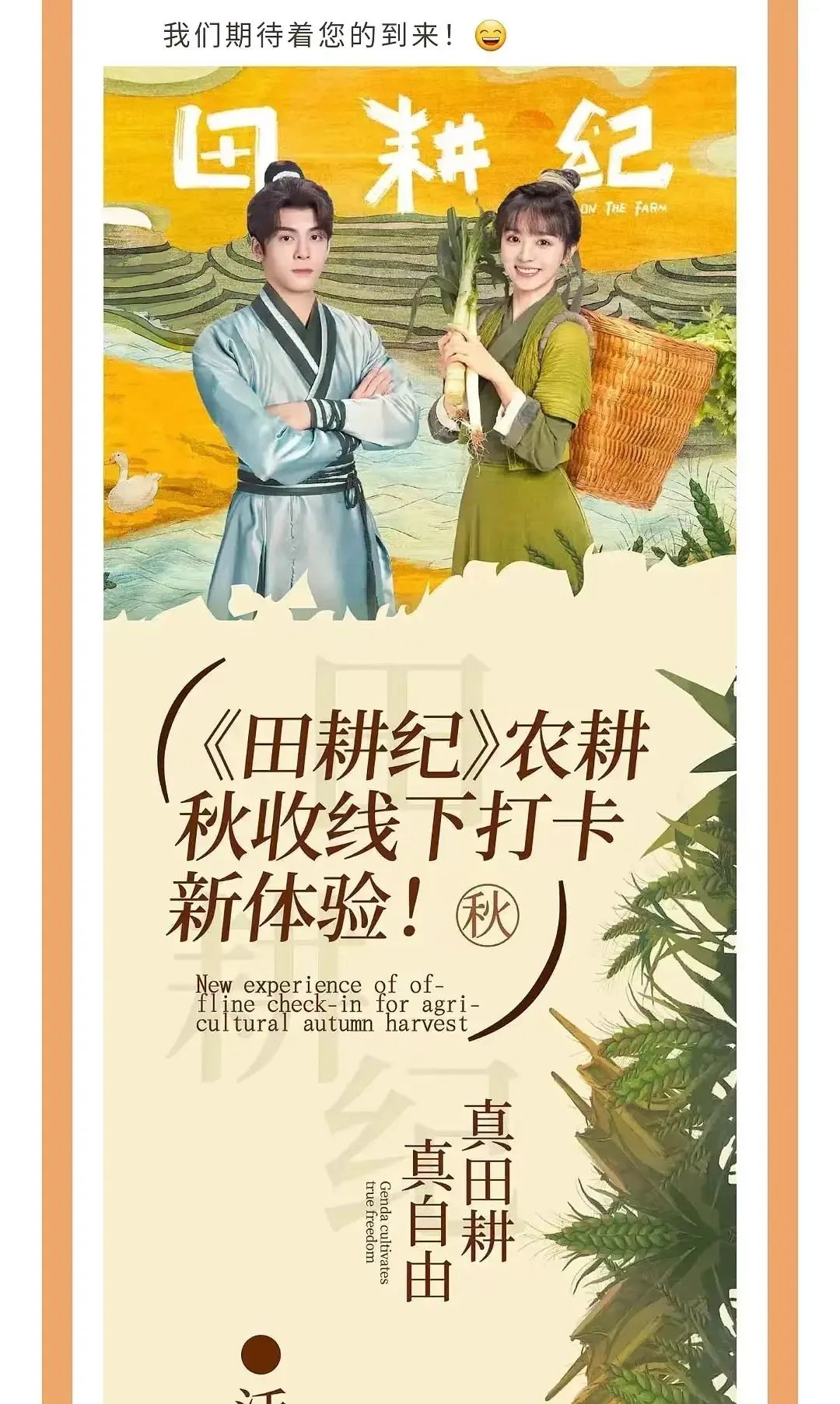 《田耕纪》尽管场景并非现实中的乡村,也能联动一些线下相关商业合作。例如和崇泰庄园合作的“秋收线下打卡”活动,也展现出田园剧在文旅方面潜藏的商业合作价值。