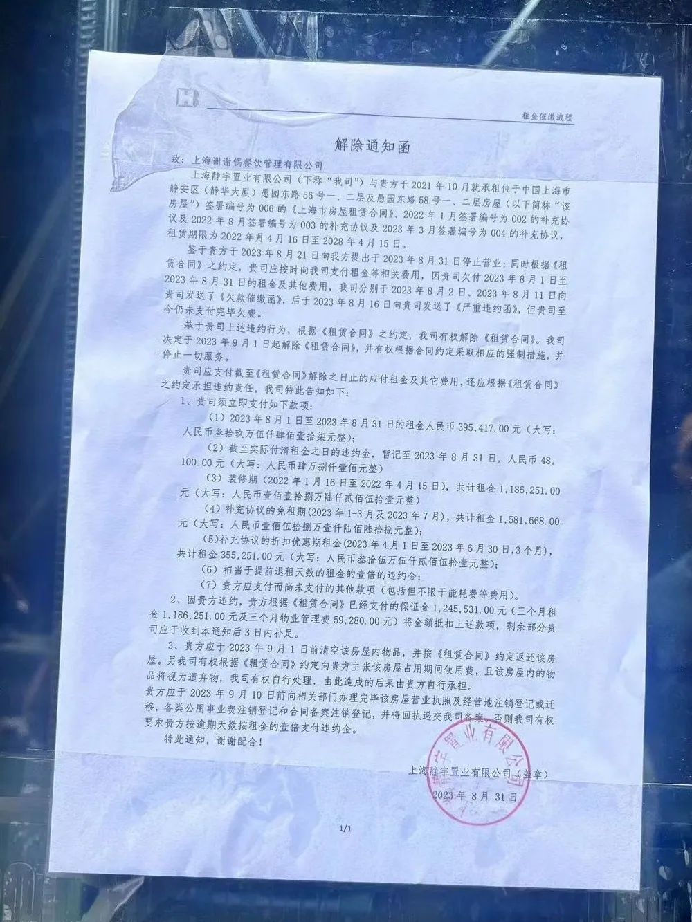 8月31日,上海静雨置业有限公司给谢谢锅发了一份解约通知函。解约函显示,谢谢锅在2023年8月21日提出于2023年8月31日停止营业,根据《租赁合同》之约定,谢谢锅应按时向该公司支付租金等相关费用。
