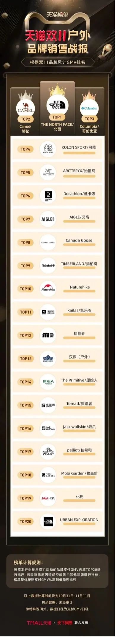 从天猫公布的数据来看,双11活动期间品牌累计GMV排名前十名分别为骆驼、北面、可隆、伯希和、迪卡依、哥伦比亚、始祖鸟、CANADA GOOSE、凯乐石和AIGLE。