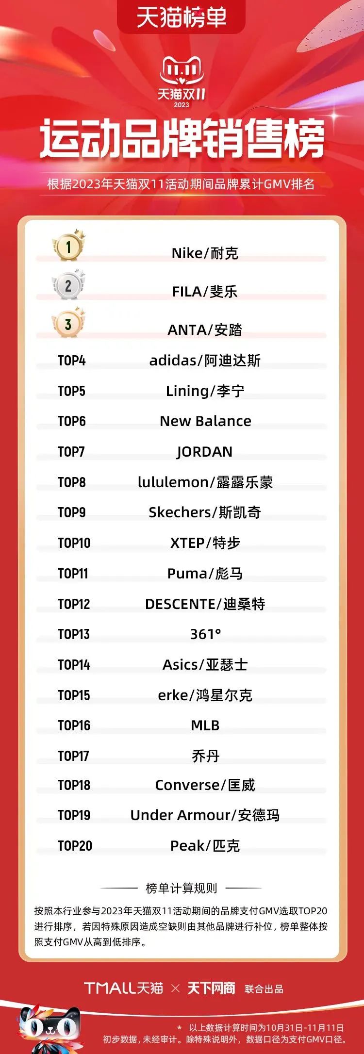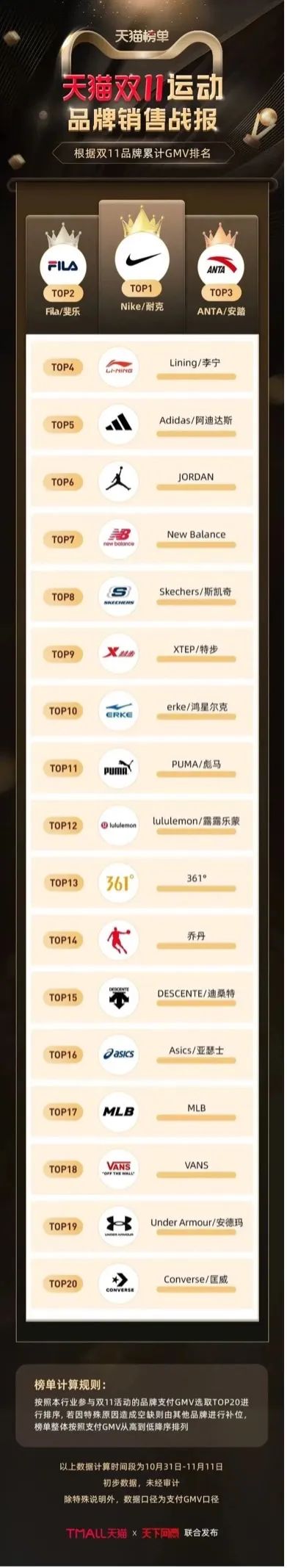 对于运动品牌而言,今年的双11,依旧是场没有战报的战事。各大运动品牌均没有主动对外公布电商交易数据,只能从天猫双11运动品牌销售榜中窥探一二。与去年相比,排名靠前的品牌几乎没有变化,耐克、FILA和安踏继续稳坐前三,比较引人注意的是鸿星尔克今年未进入TOP10之中,而Lululemon则跻身前十榜单。