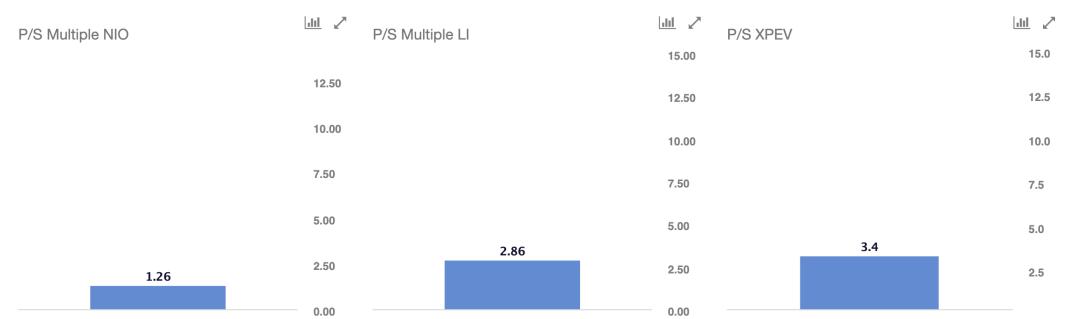 当前,蔚来的市盈率为1.26,相比之下,理想市盈率为2.86,小鹏的市盈率为3.4。