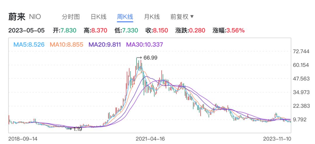 在同类公司中,蔚来的股票表现最差,年初至今下跌了约18%,与2021年的历史高点相比,跌幅超过85%。