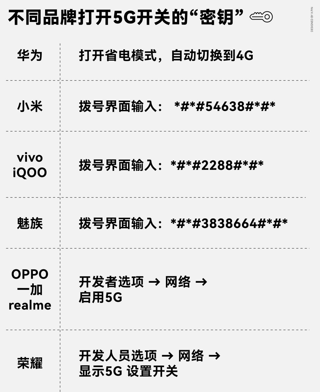 各大手机品牌其实都有打开 5G 开关选项的对应“ 解锁暗号 ”,只要打开电话拨号输入,就能解锁 5G 开关。