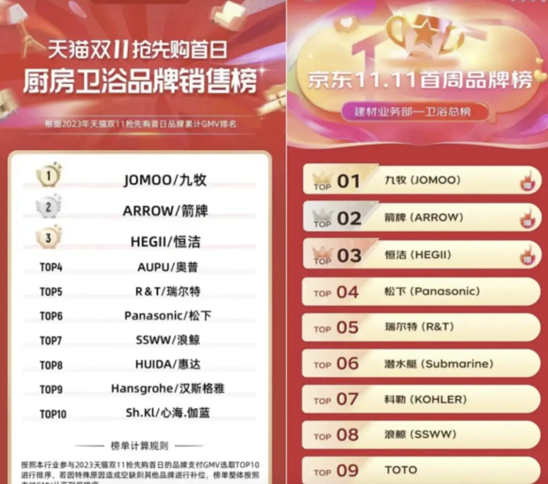 伴随着智能马桶盖的浪潮,国内卫浴品牌的排头兵九牧卫浴正在成为科技新贵。2023年双十一,九牧再次成为各大电商平台的卫浴品牌销冠,全渠道销售额超过了33亿元,同比增长32%。