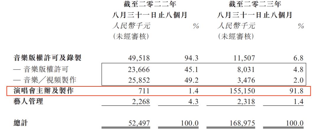 2023年6-8月,鹿晗举办巡回演唱会,因此2023年1-8月风华秋实演唱会主办及制作的收入增长至1.55亿元,占总收入的比例上升至91.8%。