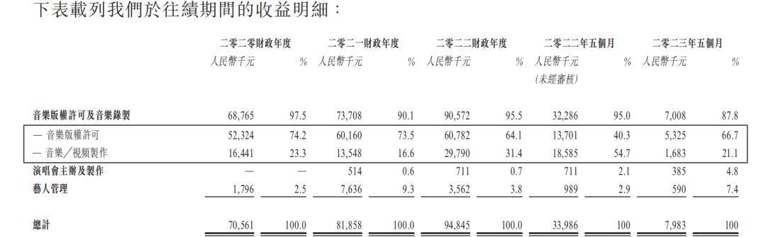 风华秋实的收入主要来自三方面,一是音乐版权许可及音乐录制,即通过自制及购买获得音乐作品,并将其授权给数码串流平台、专辑制作公司、市场营销及广告公司、电商平台及电影制作公司等;二是演唱会主办及制作,包括销售演唱会门票、演唱会广告和赞助收入以及演唱会周边产品;三是艺人管理,目前风华秋实管理15名音乐艺人,通过安排艺人参与商业活动、广告活动以及电视或线上节目产生收益。