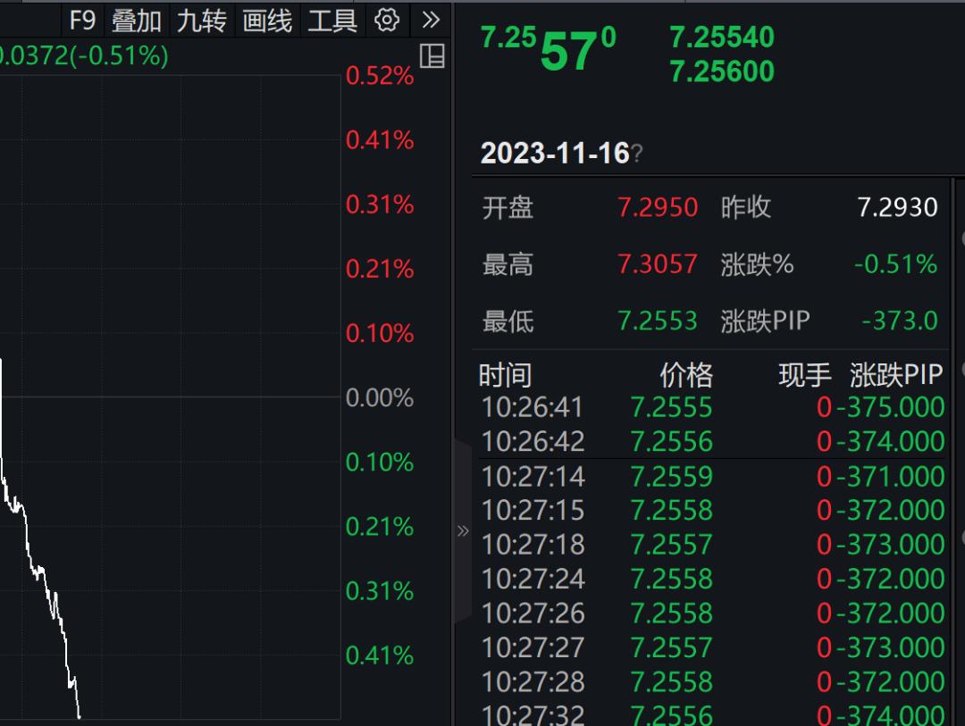 该数据公布后, 美元指数直线跳水,且兑主要货币均出现下跌。离岸人民币对美元大幅升值,截至发稿人民币大涨373个基点报7.2557。富时中国A50指数期货、恒生指数期货则是大幅拉升, 涨幅明显扩大,其中A50指数期货拉升超1%。