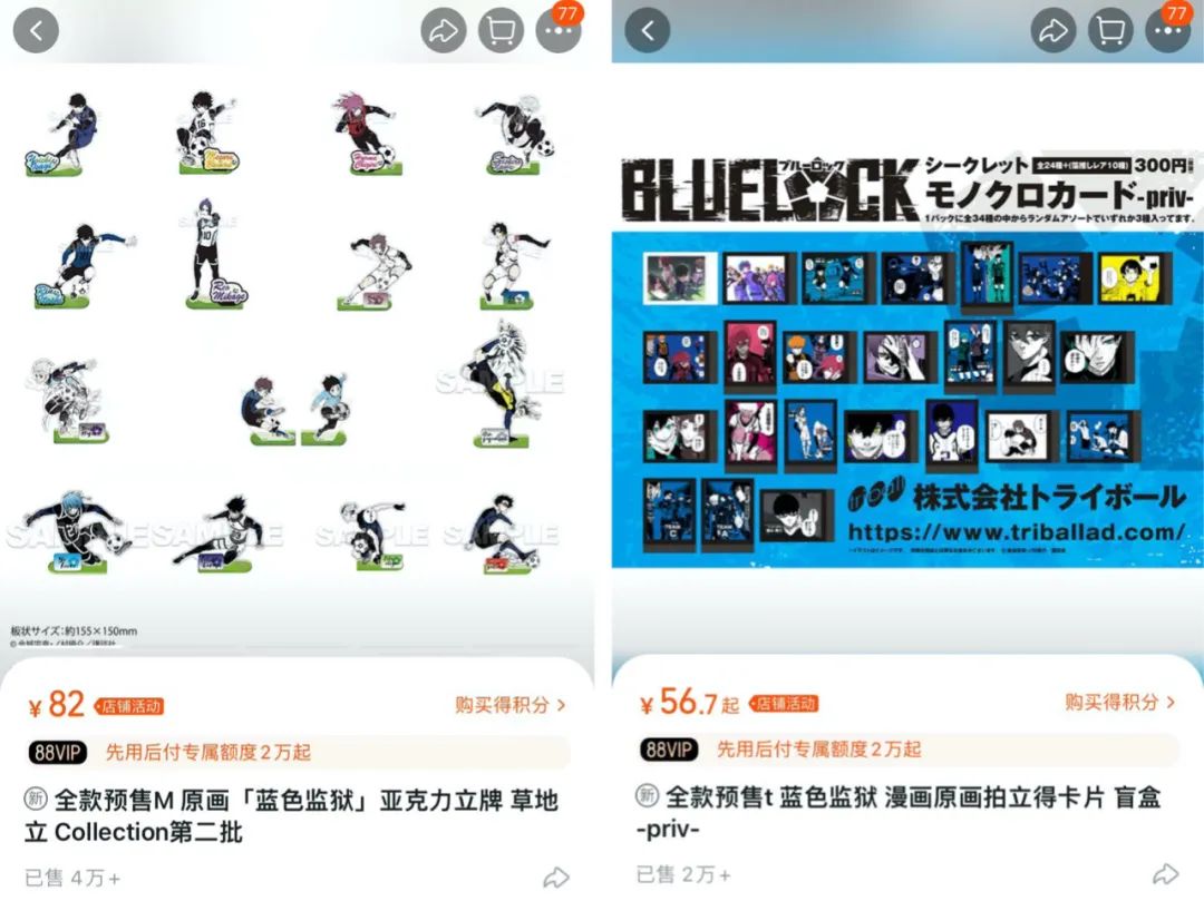 尤其是“轻周边”,在三月兽旗舰店,按实时销售排序,一款《蓝色监狱》亚克力立牌显示售出超过4万件,当前售价82元/件, 粗略计算仅该款单品在该线上店铺的销售额就已突破300万元 ,还比如《蓝色监狱》的徽章盲盒单价25.9元起,已售1万+件,该IP的拍立得卡片售价56.7元起,也卖出了超过2万件。总的来说销售情况非常的可观。这点在淘宝也有体现。